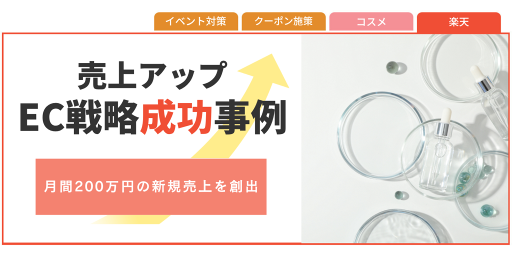 クライアントは指名検索経由でのリピート購入は安定していましたが、それ以外の潜在層や新規顧客の獲得が伸び悩んでいました。そこで、新規購入のハードルを効果的に下げる狙いで、モールの有料会員かつ未購入のユーザーにターゲットを限定した割引クーポン(10%OFF等)を発行しました。対象商品を絞り、オファー内容を最適化して月通しで継続的に実施する工夫を行いました。これにより、購買意欲の高い優良な見込み顧客へピンポイントでアプローチでき、クーポン経由の新規売上が月間200万円規模で安定して創出される結果へと繋がりました。