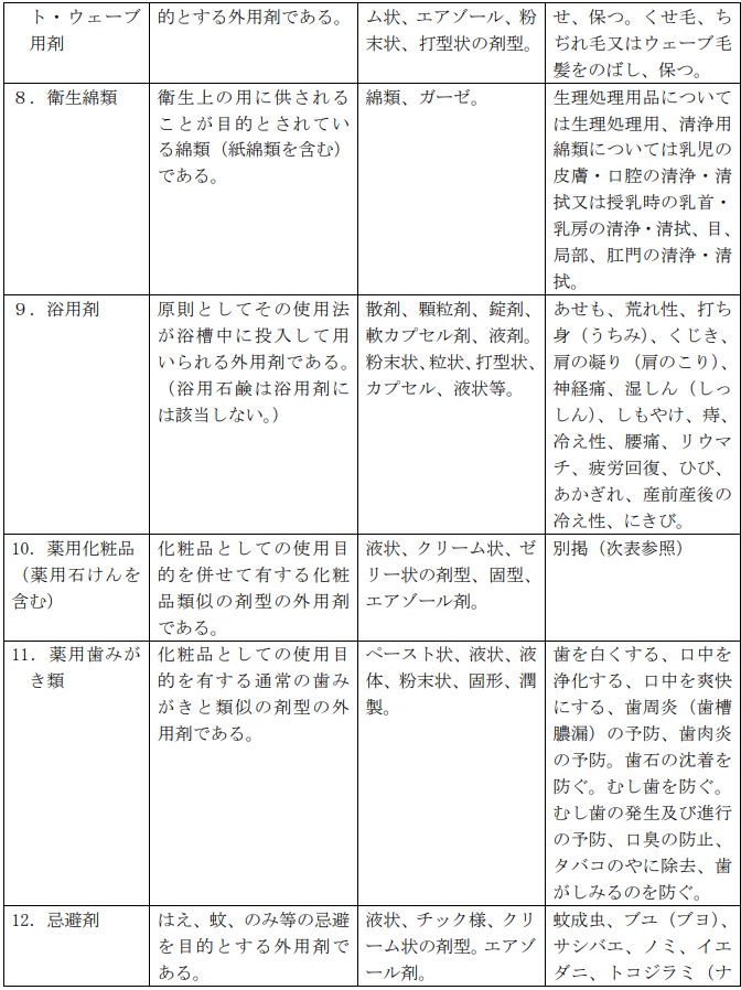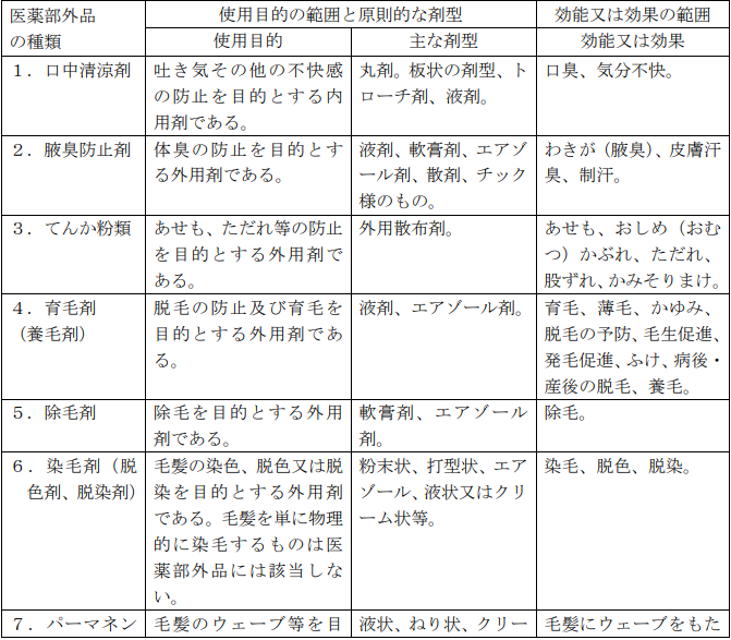 となり、化粧品はありません。医薬部外品で認められる効果効能の範囲は次の通りです。